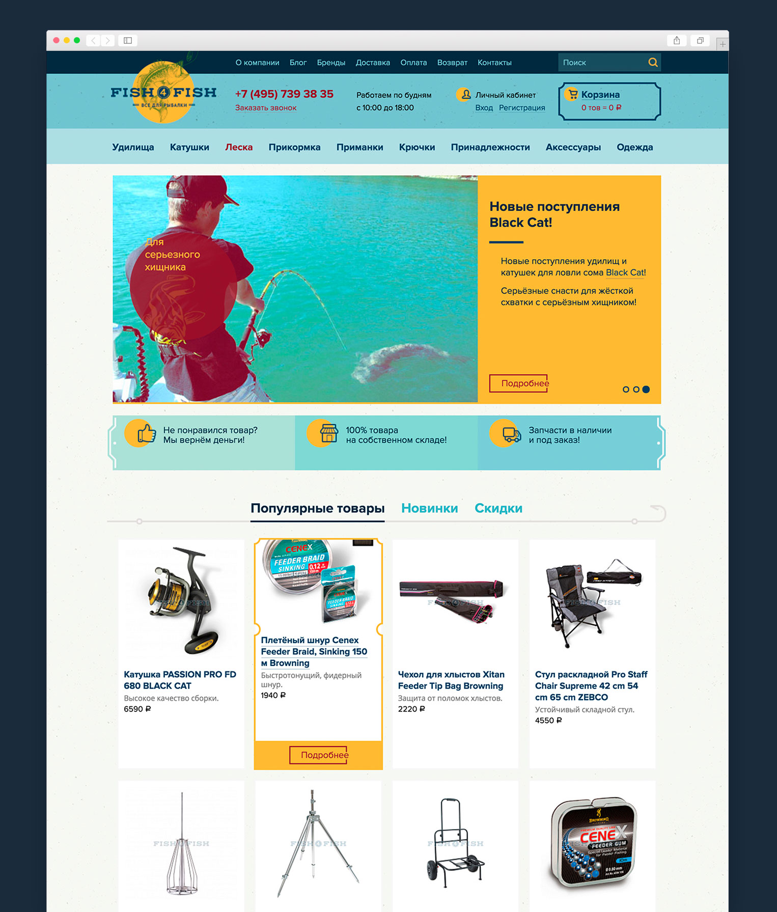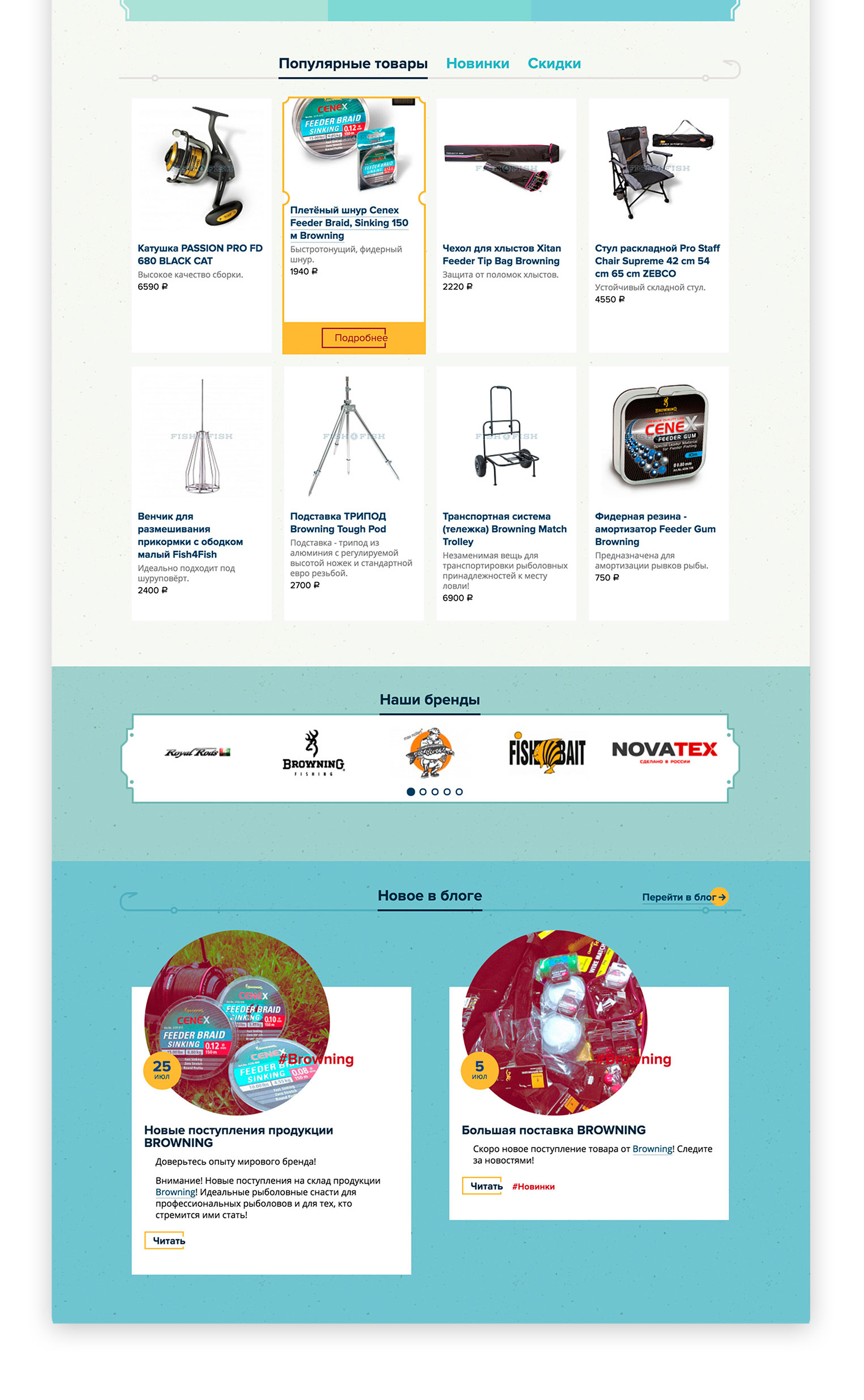 Совместно с клиентом, мы поставили себе задачу сделать дружелюбный сайт розничного интернет-магазина товаров для профессиональной рыбалки. Дружелюбность должна была проявиться не только в интерфейсе, но и в общей стилистике сайта. Мы также проработали фото-стиль для баннеров, чтобы передать солнечное настроение бренда.